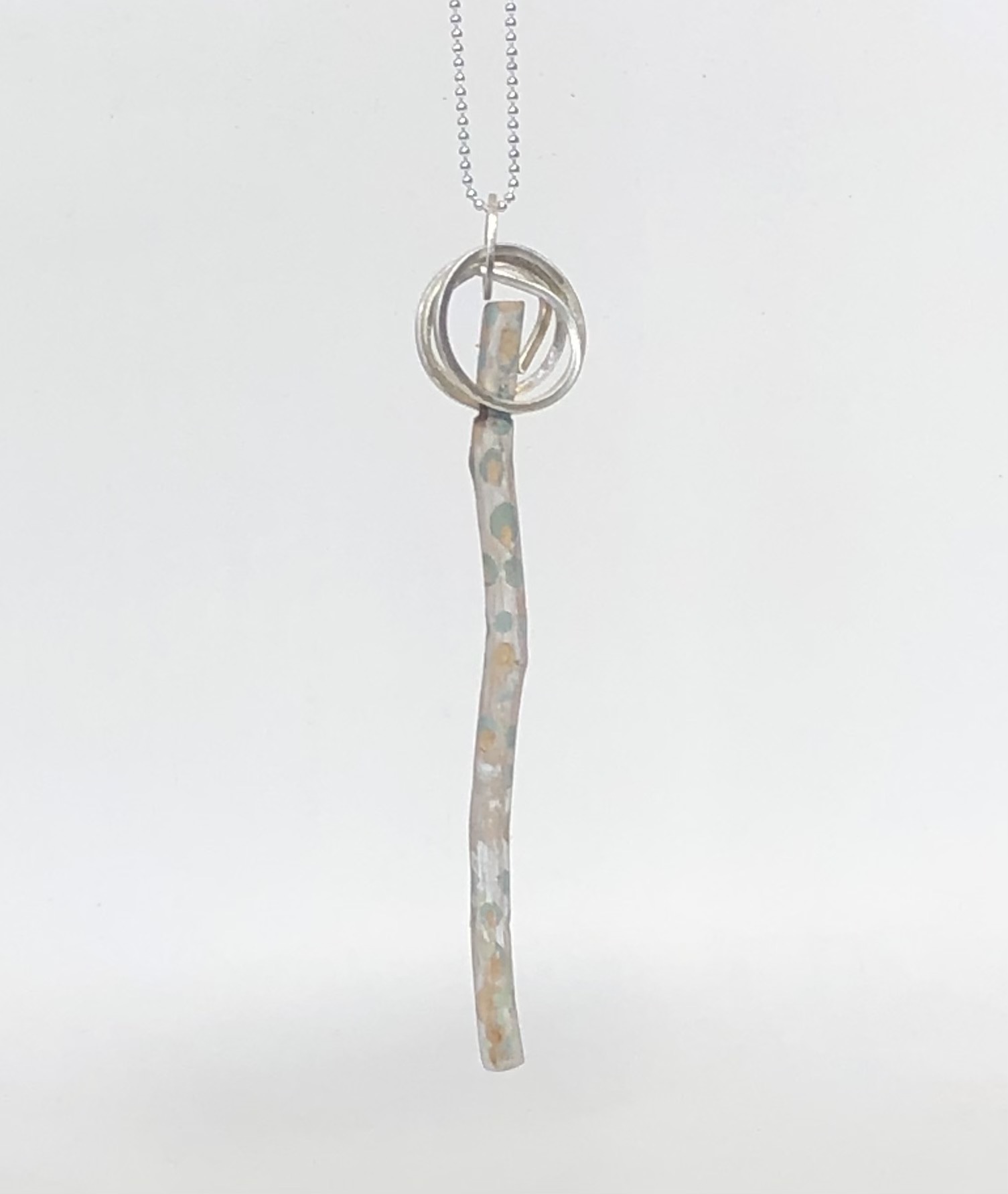 This pendant features a hand painted ‘rain stick’ made from found wood, with a silver scribble at the top, it is inspired by the rain as it falls on the rock pools and pebbles on the beach. The sterling silver ball chain is 18″ and the pendant is approx 8cms in length.