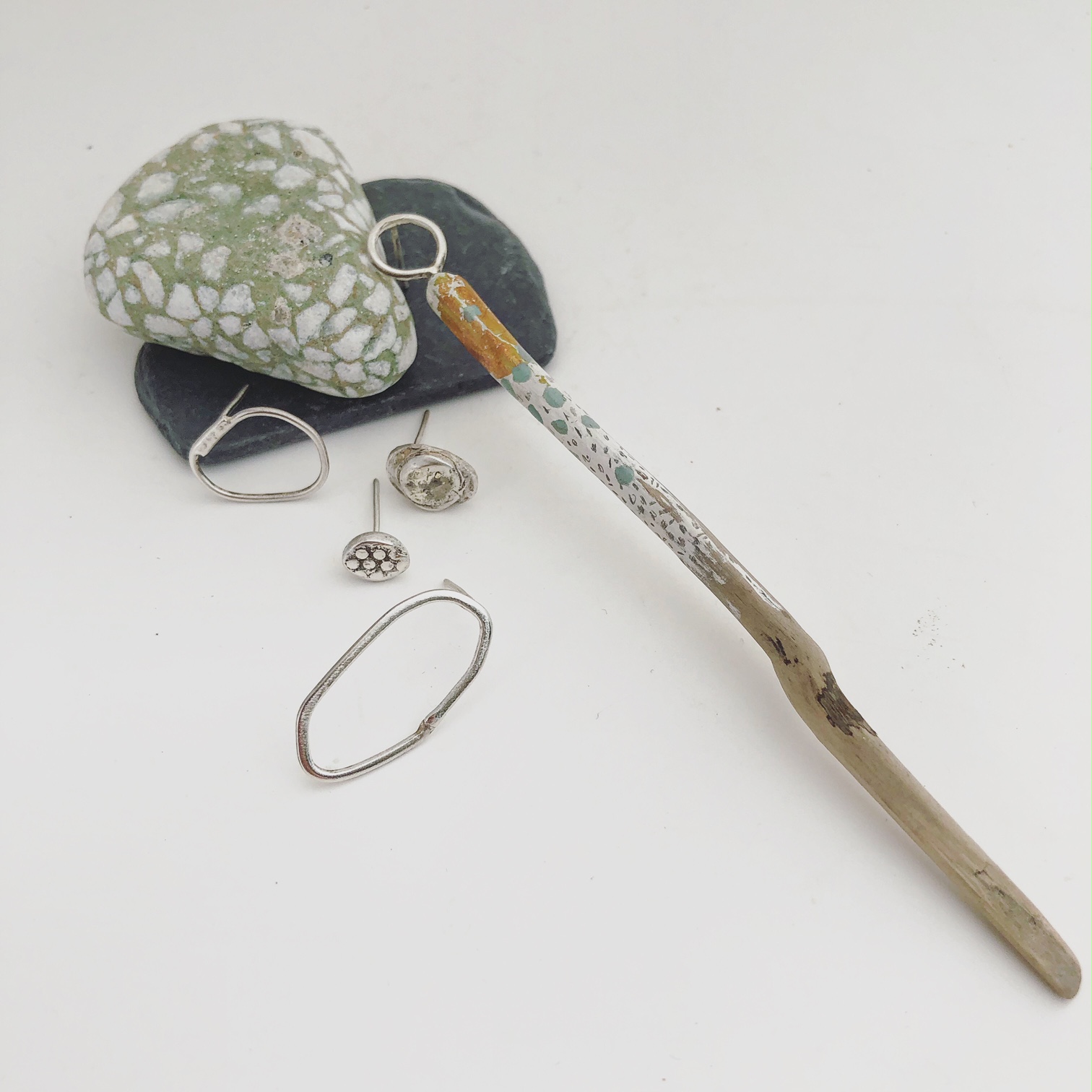 These earrings are a collection inspired by the shapes of the pebbles found on my favourite beaches, the worn pebbles, that feel soft and cool in the palm of your hand… the pebbles that weigh down pockets and fill up buckets… The rain stick stud is made using found driftwood and has been inspired by the raindrops as they splash onto the rock pools. This collection is designed so you can wear one, two, three, mix and match to suit how you feel. The pebble circle studs are approx 1-1.5cms and the rainstick is approx 8cms long. All the studs are made using recycled silver and they all have sterling silver butterfly backs.